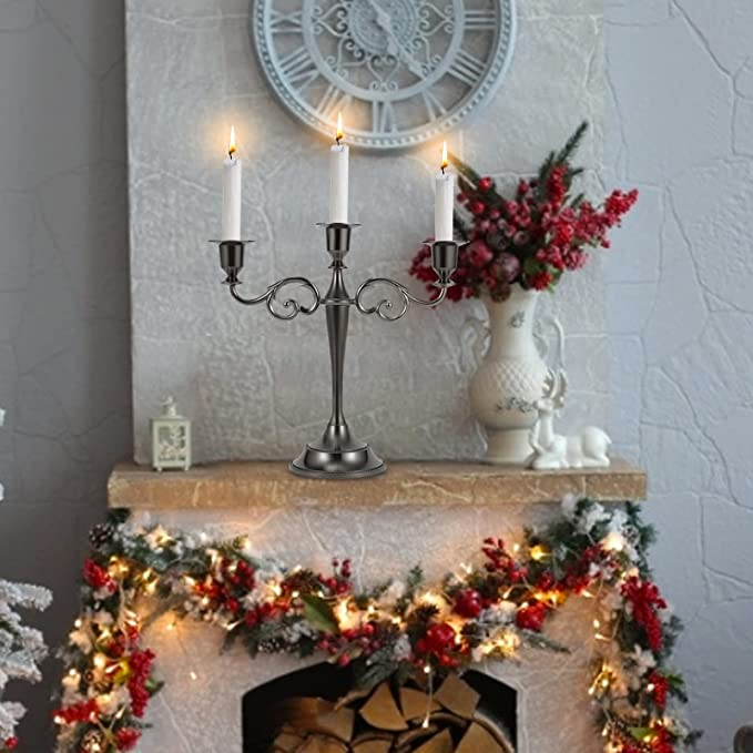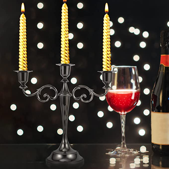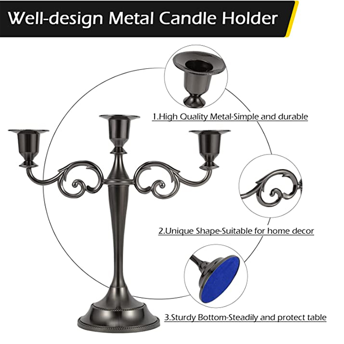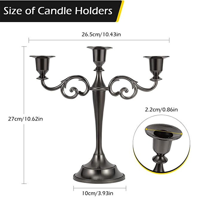 3 arms Stand Candlestick Holders- The 2pcs 3 arms candelabra candle holder can hold six long candles at the same time. (Suit for diameter less than 0.86" candles and not included candles) High-quality Metal Materials- European-style candelabra candle made of metal electroplating with strong anti-corrosion and anti-rust properties. The zinc alloy structure makes the metal candle holder durable.