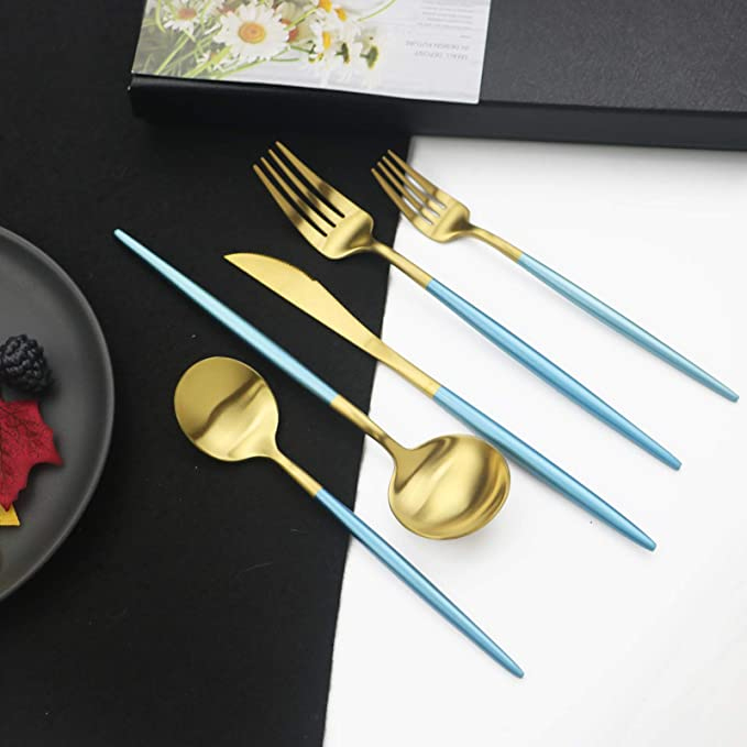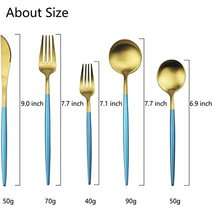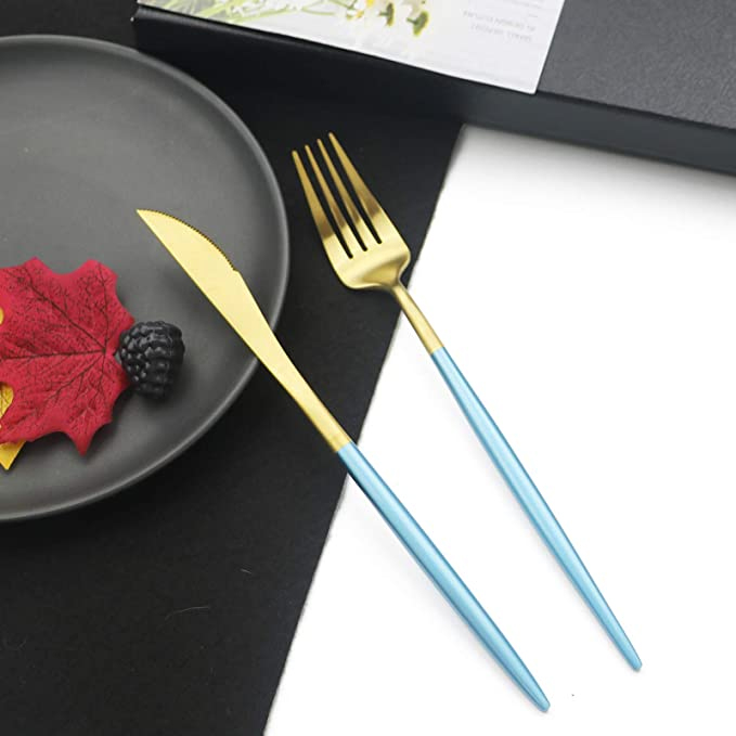 Made of high quality 18/10 stainless steel material,sturdy and durable,heat-resistant, anti-rust with a brushed finish, smooth edge no rough spot.We have thoroughly tested our dinnerware to make sure that your family will be able to enjoy dinner with style!Our utensils include 1 set of knives, different sized spoons, different sized forks! We want your family to enjoy this 6 pcs set every night for dinner! Unique Design: Attractive and simple design with clean lines will match with your existing flatware more naturally and also make a nice addition to your kitchen. Suitable for iced tea, coffee or anything in a glass that needs stirring or spooning. Perfect for bar, home, party use.The flatware set is designed well, each utensil has a compartment so that they aren't bumping into each other, which can build up unnecessary wear. Easy to use and clean - Dishwasher safe; Suitable for use in hotels, homes, bars, parties. Suitable for travel, camping, school or work.Buying silverware is never something that just comes to mind. We want to provide you with the highest quality and durable dinnerware kitchen set there is! Using our matte black utensil set of 1 will be able to provide your family, kids, and friends with the right cutlery for the job! Wash your stainless steel utensils with no problem and use them daily! Perfect Gift Choice: 1 (7.25") salad forks, 1 (8.75") steak forks, 1 (8.5") steak knives, 1 (8.5") dinner spoons, 1 (7") soup spoons,as gift to your friends or families at Christmas, Birthday, Mother's Day, Father's Day, Valentine's Day and so on.JASHII always here to help, feel free to email or call with any questions or concerns. Material Stainless Steel Color Blue Gold Product Care Instructions Dishwasher Safe Recommended Uses For Product Travel Special Feature Rust Resistant Finish Type Brushed Included Components Case Style Modern