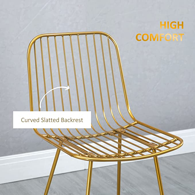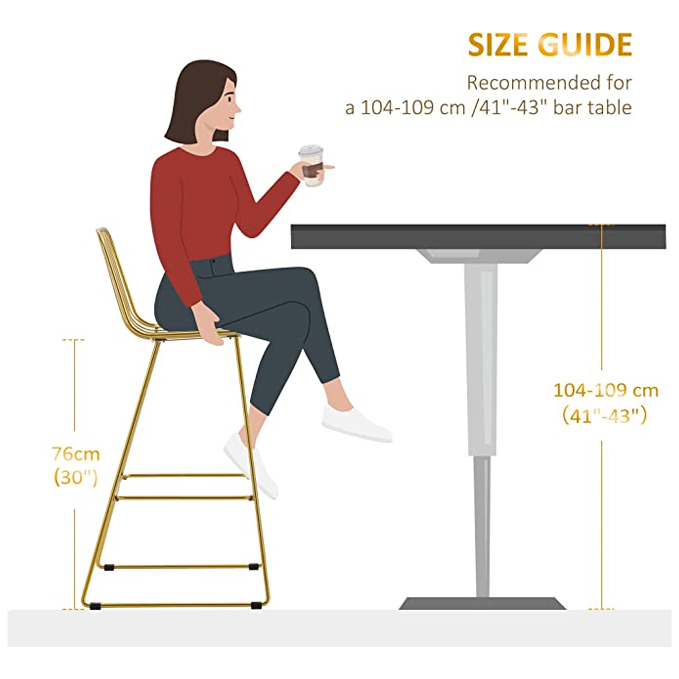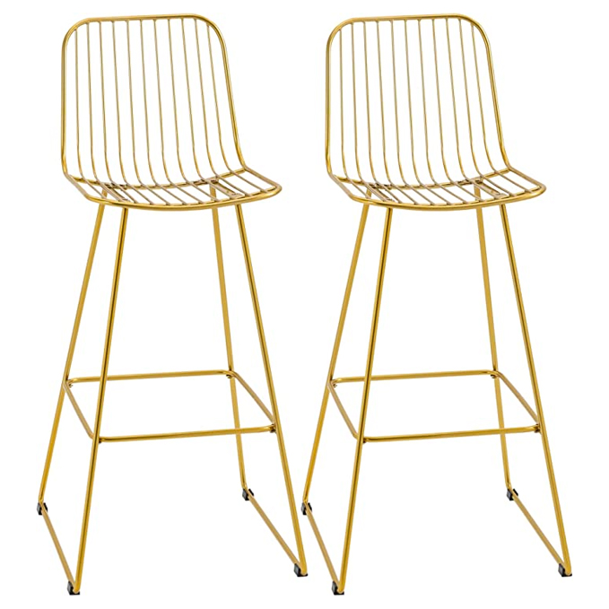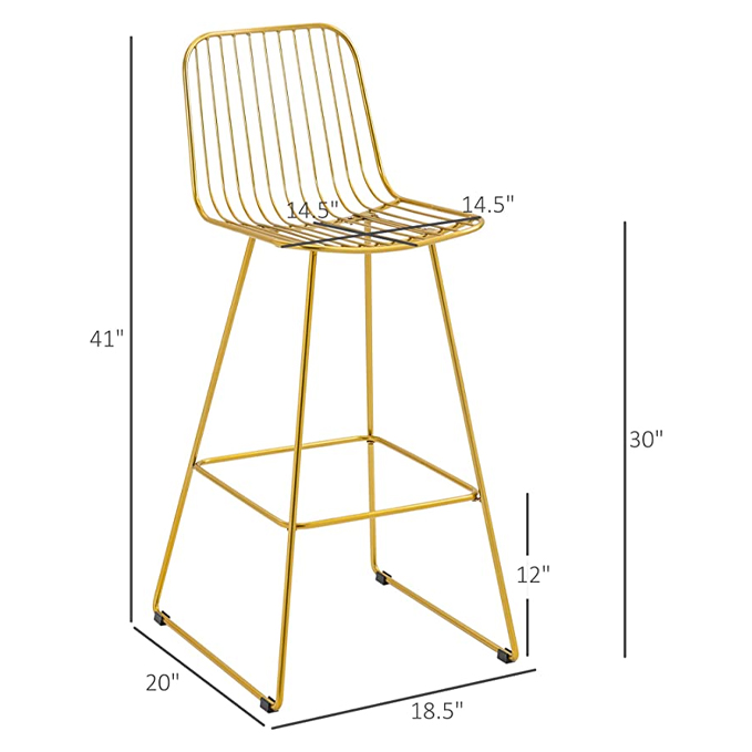 Packaged in a Set of 2: This set includes two metal bar stools. They are designed to have a drink or conversation for two. Looking Good: The luxurious design makes the bar chair more attractive and can fit any room. The sleek metal wire makes it looks modern and stylish. High Comfort: The bar stools with back and footrests can help keep a relaxed body posture and reduce fatigue. Stable Build: Sturdy powder-coated steel frame and stable legs can keep the bar height stools balanced when in use. There are non-skid plastic pads at the bottom to provide protection. Bar Chairs Information: Overall Dimensions: 18.5" W x 20" D x 41" H. Seat Size: 14.5" W x 14.5" D. Seat Height: 30". Weight Capacity: 264 lbs. Assembly Required. Suitable for bar table Height: 41"- 43".